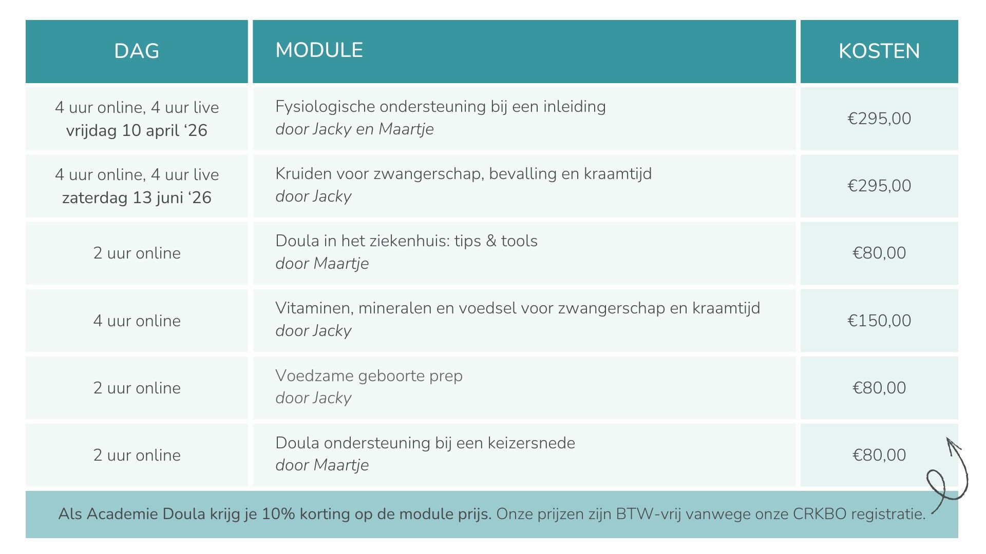 Na module 1 ga je door naar de Klinische Kennis Training waar er eventueel andere doula's zullen zij-instromen als ze al eerder ergens anders een doula opleiding hebben gevolgd. De live lesdagen van modules 2 t/m 4 zijn in september en oktober 2026.