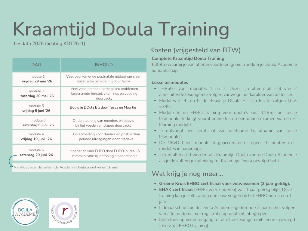 Modules KDT3, KDT4 en Bouw je DOula Biz van de Doula Academie Kraamtijd Doula Training kosten €395,- per module.